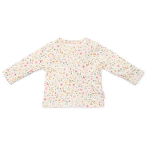 This long-sleeved t-shirt features an adorable all-over print of flowers, leaves, birds, hedgehogs, and more.