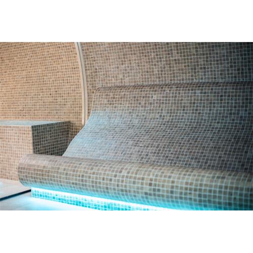 Ergonomically shaped benches in rigid foam, tiled with Ezzari mosiac.
