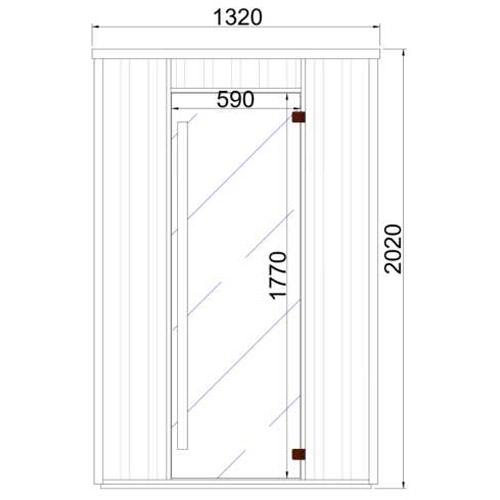 - Tinted safety glass door 1770 mm x 590 mm x 8 mm with brown hinges and cedar handle.