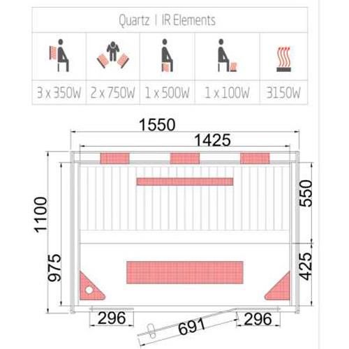 - Quartz infrared radiators, floor heating, including rotating radiators in the side walls.
