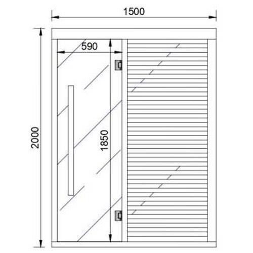 - Glass front and sides in clear tempered glass 8 mm thick, inclusief door 1850 mm x 590 mm x 8 mm, stainless steel handle outside and wood inside.