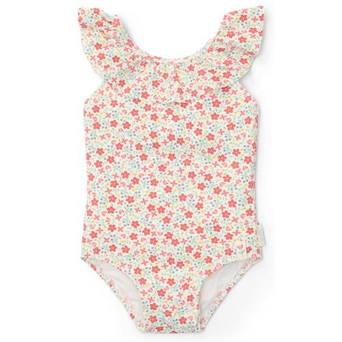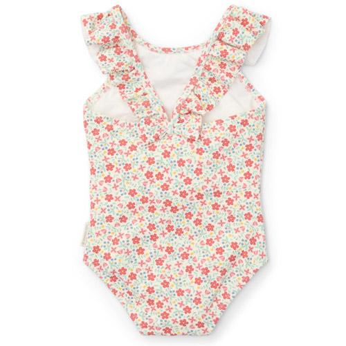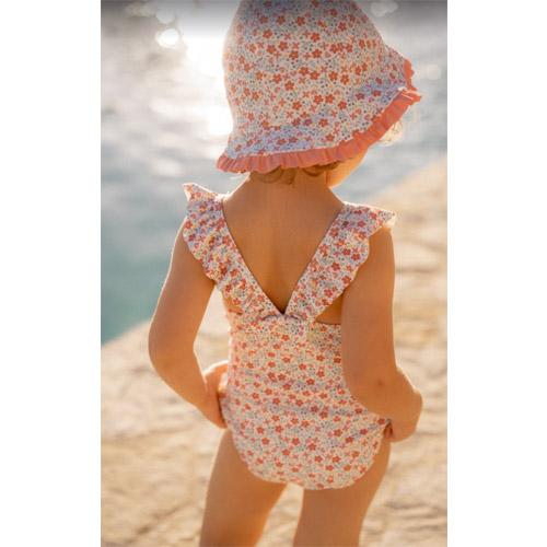 The Sunny Flowers bathing suit boasts a fine print of small pink flowers interwoven with delicate green branches.
