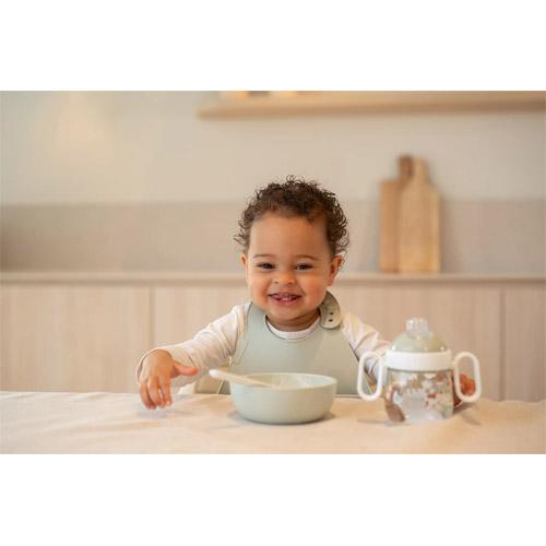 The Mepal Mio bin with the cheerful Little Farm print from Little Dutch protects clothes during mealtimes and helps your child practice eating independently.