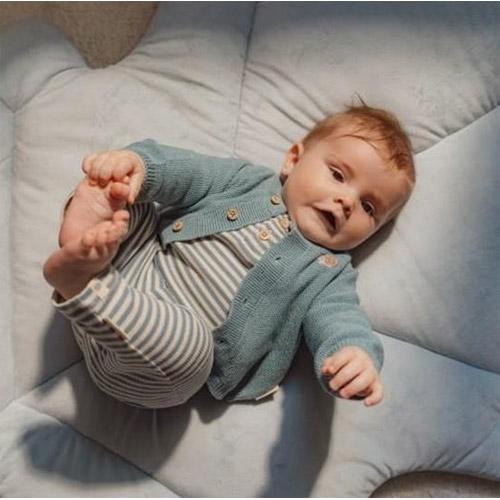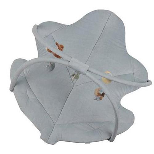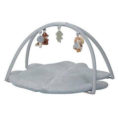 The blue mat has two large corduroy arches with five different cuddly toys from the Forest Friends collection hanging from them.