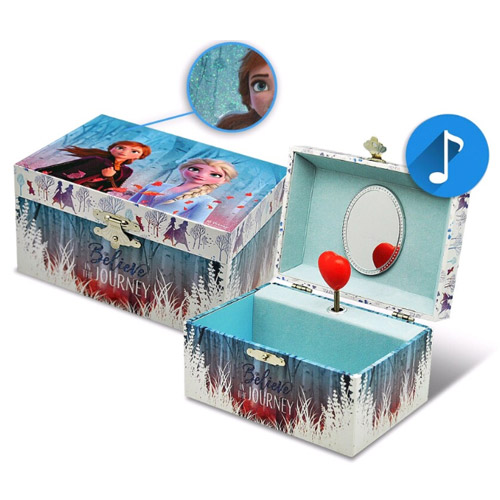 Range tes plus beaux bijoux dans la boîte à bijoux musicale Reines des neiges, équipée d'un miroir.