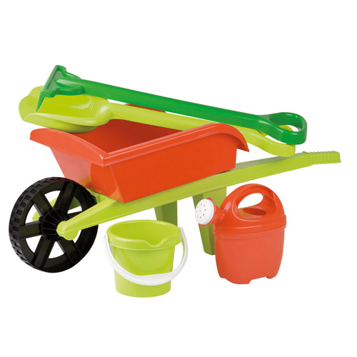 Prend ta brouette avec tous ses accessoires pour jardiner, construire des châteaux, arroser les plantes... bref vivre la belle vie au grand air! Brouette en plastique, pelle, râteau, seau et arrosoir.