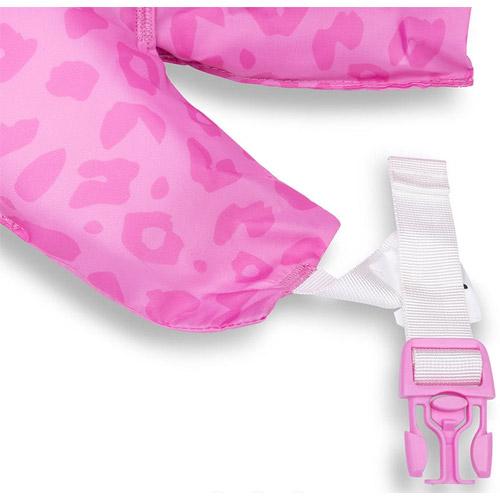 Cette veste de natation avec imprimé léopard rose fluo convient aux enfants de 2 à 6 ans peseant entre 15 et 30 kg.