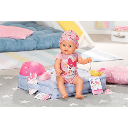 Cette filette Baby Born n'a pas très envie de fermer les yeux mais pas d'inquiétude, il suffit de tourner sa tétine dans sa bouche et elle s'endorent comme par magie!