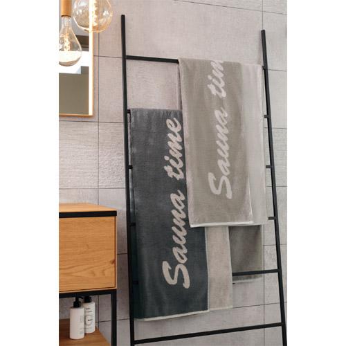 De charmante saunahanddoek Sauna Time bewijst zich door zijn sterk absorberende badstof kwaliteit en modern design.