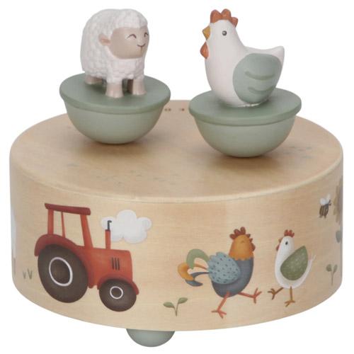 Cette boîte à musique ronde est décorée d'une scène joyeuse du thème bien-aimé de la Petite Ferme.