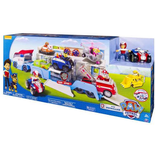 Tu peux mettre deux véhicules à l'intérieur et 4 voitures de Paw Patrol à l'extérieure.
