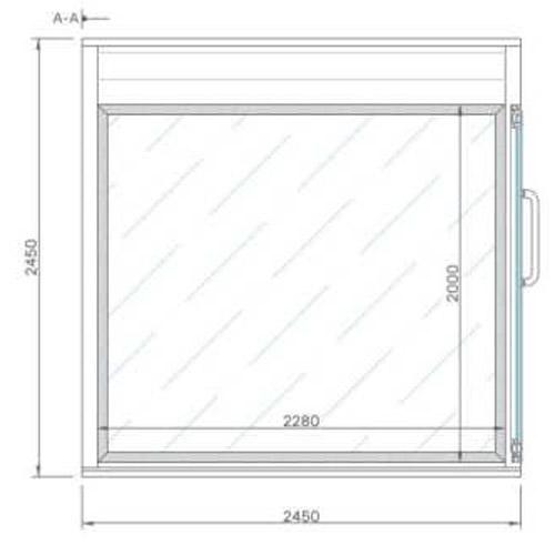 Naadloze voorwand, glazen deur aan de zijwand met D-handvat en symmetrisch tegenoverstaand raam in dubbel gehard helder glas met aluminium frame.