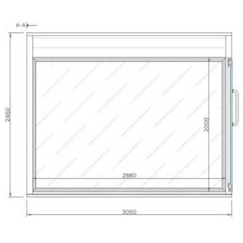 Naadloze voorwand, glazen deur aan de zijwand met D-handvat en symmetrisch tegenoverstaand raam in dubbel gehard helder glas met aluminium frame.