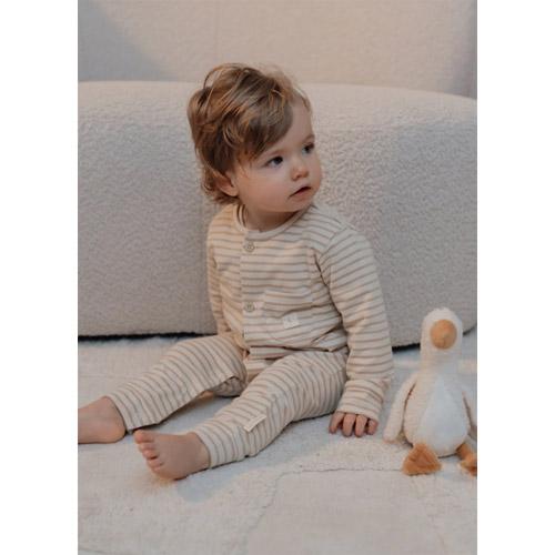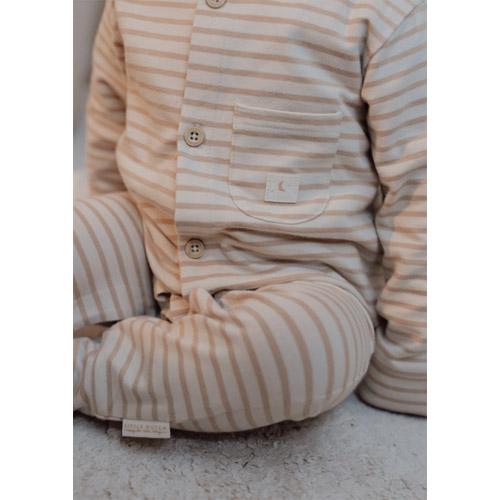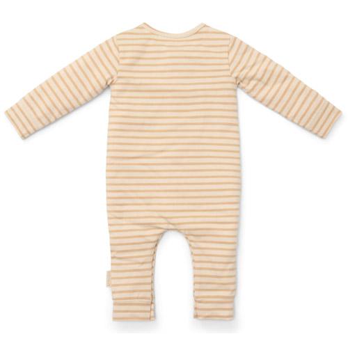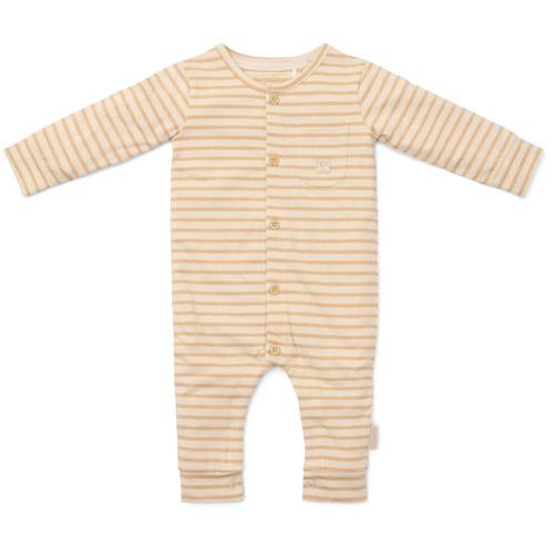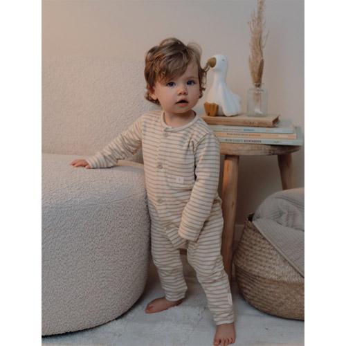 Deze onesie heeft een klassiek ontwerp met witte en beige streepjes, en combineert comfort met stijl.