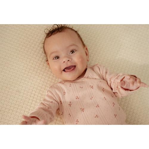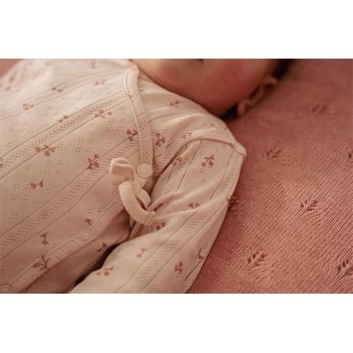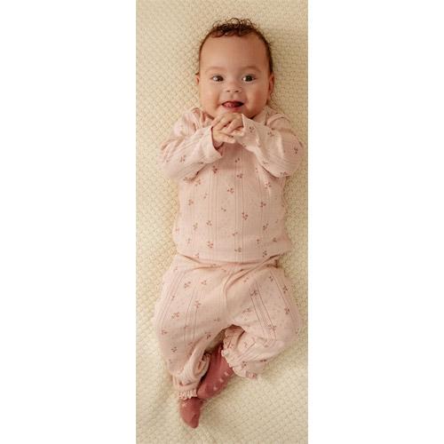 De verfijnde pointelle structuur van de stof, in een prachtige lichte tint roze, is versierd met een betoverende print van kleine bloemetjes.