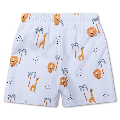 Deze zwemboxer is voorzien van een levendige Jungle-print met palmbomen, leeuwen en giraffen op een frisse witte achtergrond.