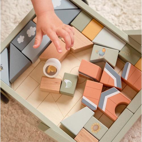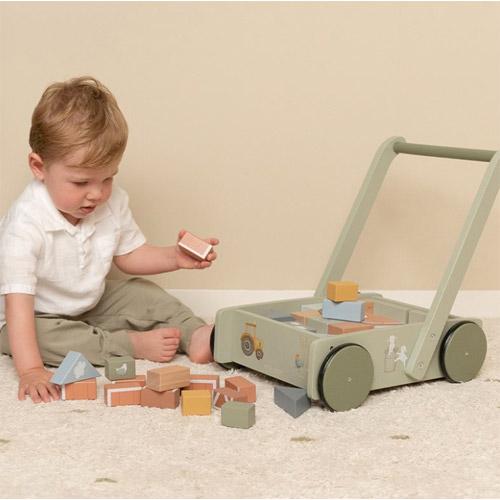 De blokkenkar is voorzien van houten wieltjes en gevuld met gekleurde houten blokken met daarop prachtige tekeningen uit de Little Farm collectie.