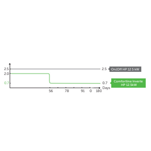 Om de zwembadtemperatuur gewoon op peil te houden, zal de Comfortline Inverter op lagere snelheden draaien en daardoor minderverbruiken met hogere COPs tot gevolg.