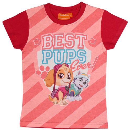 Rode gestreepte T-shirt van Paw Patrol met een afbeelding van Skye en Everest uit de Paw Patrol saga.