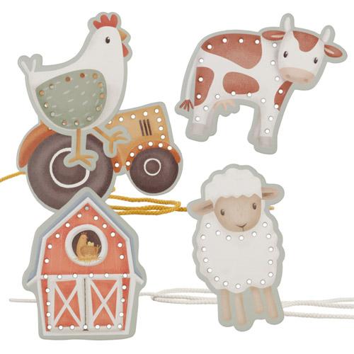 Deze set rijgkaarten wordt geleverd met twee veters en 5 kartonnen kaarten voorzien van de prachtige illustraties van de Little Farm collectie.