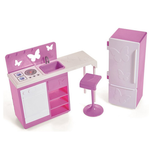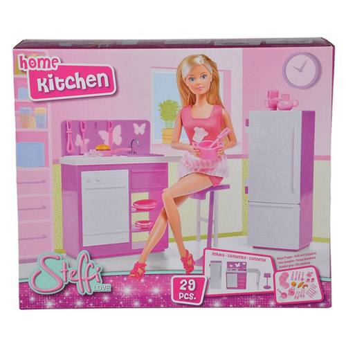 28 accessoires meegeleverd: fornuis, gootsteen, koelkast en kruk, borden, bestek, steelpan, potten, theepot, kookgerei, croissant, hotdog, hamburger, ...