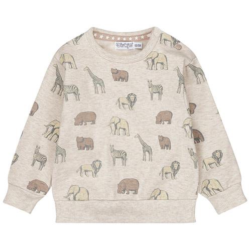 De lichtbruin gemêleerde kleur geeft de trui een warme uitstraling, terwijl de toffe print met wilde dieren hem een avontuurlijke twist geeft.