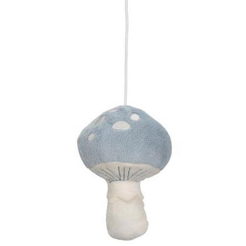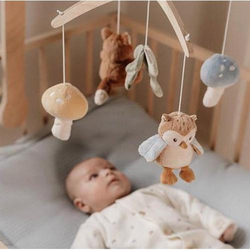 Aan de mobiel hangen vijf speeltjes uit de Forest Friends collectie: een vosje, twee paddenstoelen, uil en blaadje.
