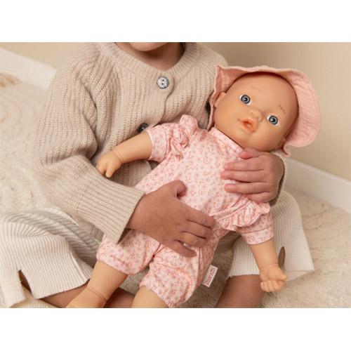 Om deze charmante outfit compleet te maken, zit er een schattig roze zonnehoedje bij.