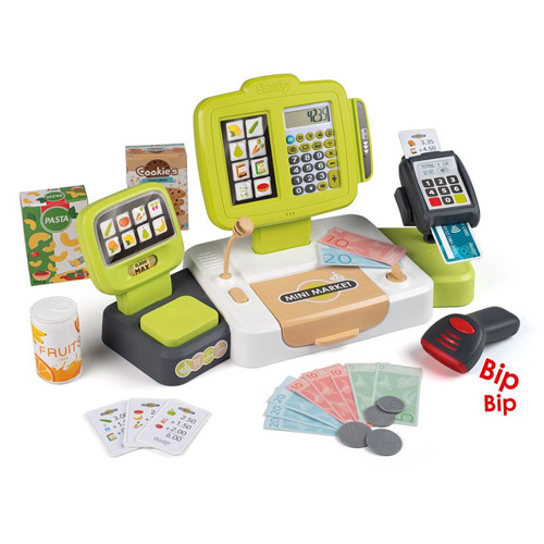 Geldlade, touchscreen weegschaal, rekenmachine, bancontact, een echte microfoon en scanner: met deze elektrische kassa van Smoby heeft het allemaal!