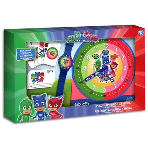 This fun and educational set consists of an analogue PJ Masks watch, a plastic clock with hands and several cards.
