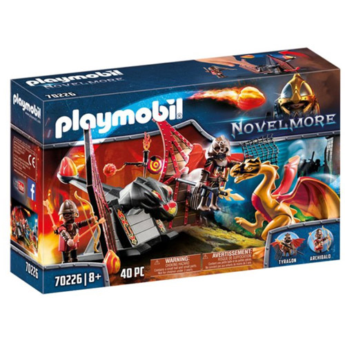 The playset includes the new Novelmore figures dragon trainer Tyragon and fire archer Archibald Blazebow, a dragon, a catapult with three fireballs and other large dragon training devices.