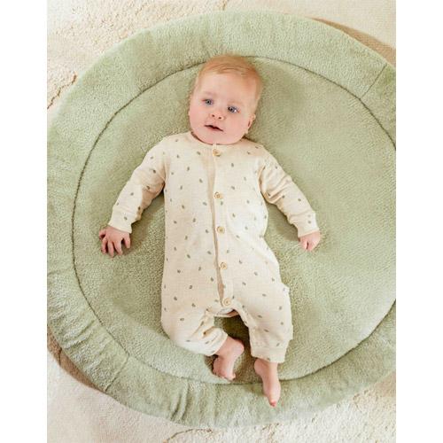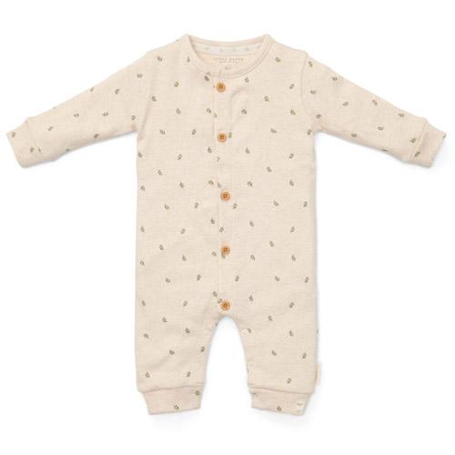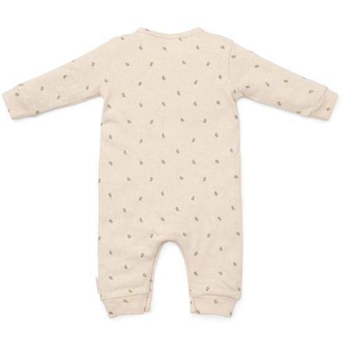 This adorable romper in a sand-coloured melange is decorated with a sweet print of small green leaves.