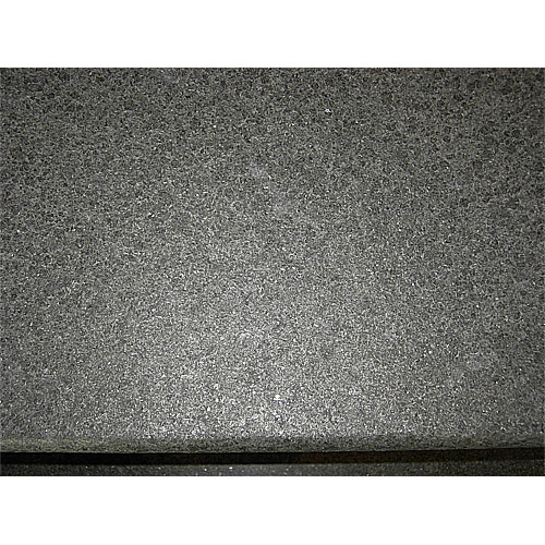 Basalt with a grey-black color and small darker spots in which rounded or circular grey minerals can be recognized.