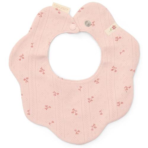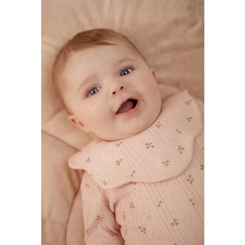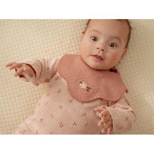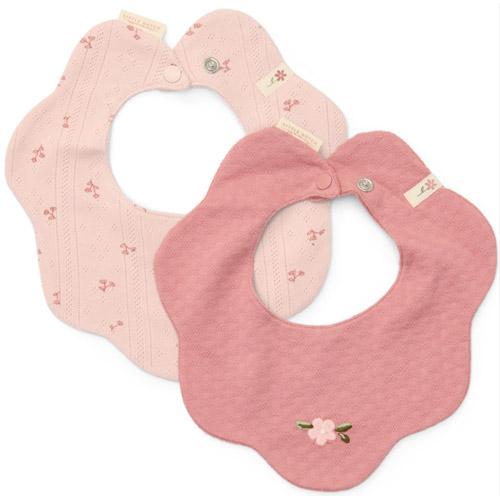 The light pink bib has a fine pointelle structure, while the solid-coloured bib is adorned with a cute little flower embroidery.