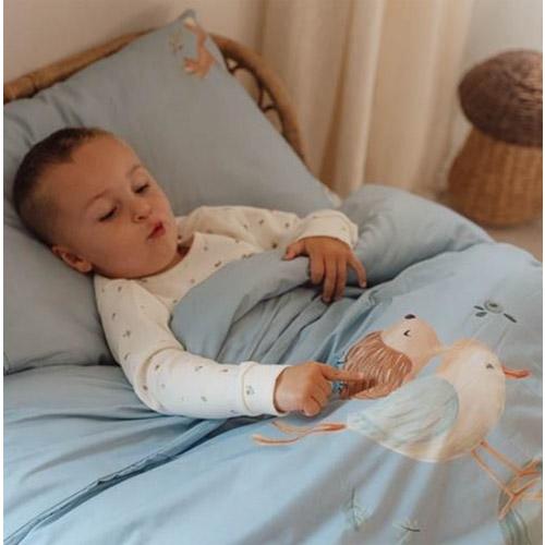The soft duvet cover is made of 100% organic in a plain Denim Blue color decorated with a playful scene from the forest.