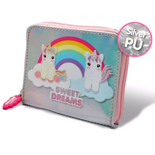 The Sweet Dreams money holder is silver with an image of two unicorns, finished with glitter.