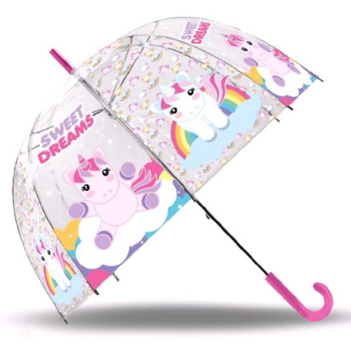 You will stay dry while it rains with this beautiful transparent Sweet Dreams unicorn umbrella!