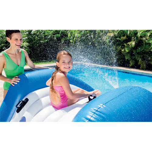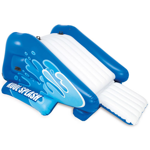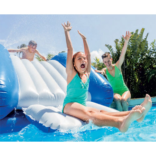 Inflatable slide to be placed at the edge of your built-in swimming pool, equipped with 2 fountains that you can connect to your garden hose to spray the slide area and create an even faster sliding effect.