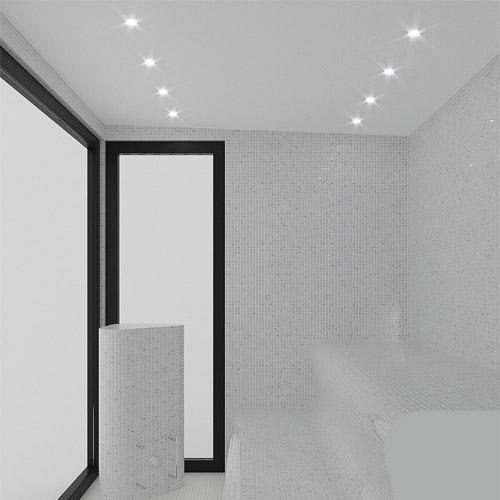 Finition intérieure: murs, banquette, meuble indépendant et socle en mousse EPS rigide revêtue de mosaïque Ezarri.