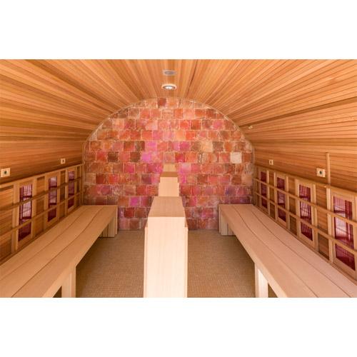 Mur du fond revêtu de pierres de sel brutes avec éclairage indirect.