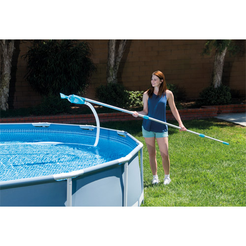 - Manche télescopique en aluminium inclus de 279 cm à utiliser dans des piscines hors sol avec une largeur de maximum 549 cm.