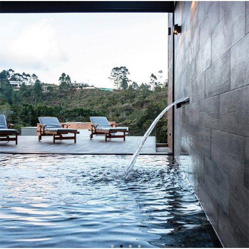 Pour plus de détente et charme auprès de votre piscine il y a les fontaines ou rideaux d'eau celle-ci donne une oasis de sérénité.