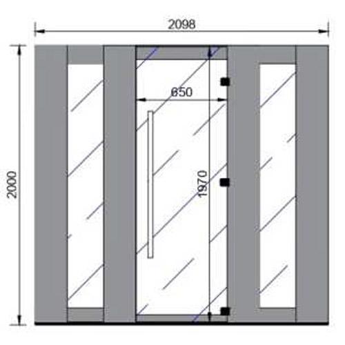 - Porte en verre trempé transparent 1970 mm x 650 mm x 8 mm d'épaisseur et deux fenêtres en verre de sécurité de 8 mm d'épaisseur.