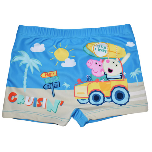 Boxer de bain avec une image de Peppa Pig et Rebecca Rabbit.Boxer de bain bleu clair avec taille élastique.Disponible en différentes tailles: 2 ans - 4 ans - 6 ans.