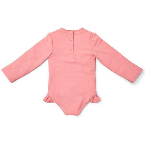 Ce maillot de bain à manches longues a une belle base rose rougeâtre parsemée d'un joli design floral imprimé sur toute la surface et d'une jolie fleur ensoleillée sur le devant.
