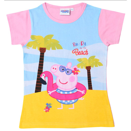 T-shirt rose clair de Peppa Pig, avec une image de Peppa Pig à la plage.