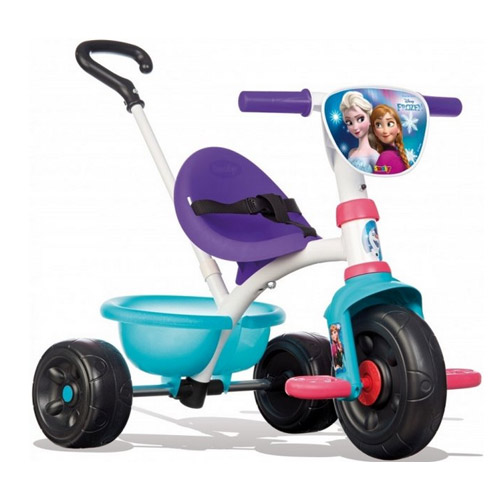 Idéale comme premier vélo est le tricycle de Smoby avec le motif des Reines des Neiges, prévu d'un ceinture pour plus de sécurité et d'une canne parentale pour guidé votre enfant.