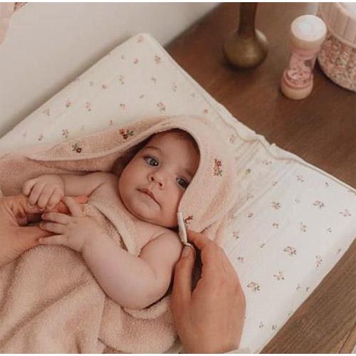 Le motif Fairy Blossom, blanc cassé avec de jolies fleurs roses, sera du plus bel effet sur la table à langer.