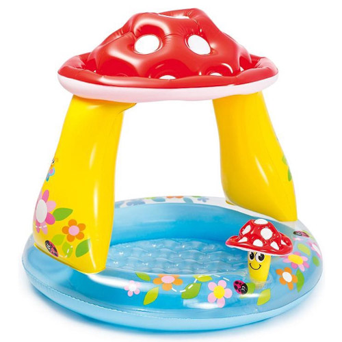Het Paddenstoel baby zwembad van Intex is voorzien van een zonneluifel om uw baby wanneer de zon te hevig is uit de zon te houden.