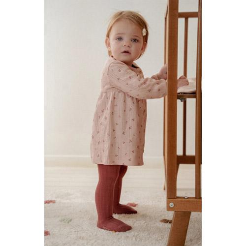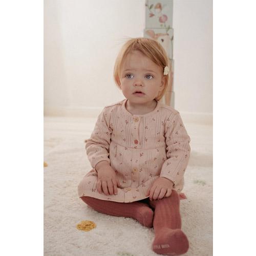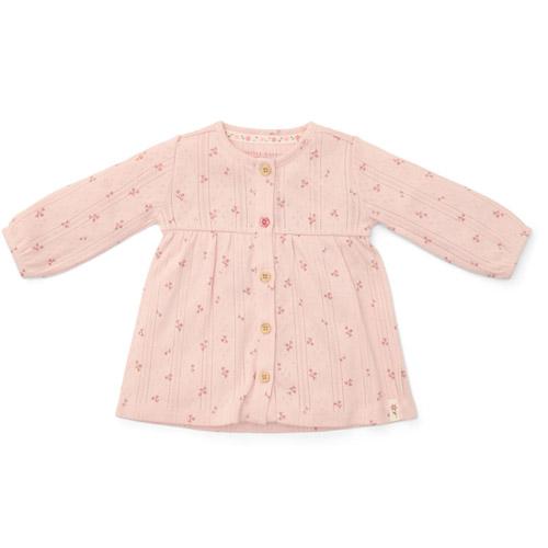 De verfijnde pointelle structuur van de stof, in een prachtige lichte tint roze, is versierd met een betoverende print van kleine bloemetjes.